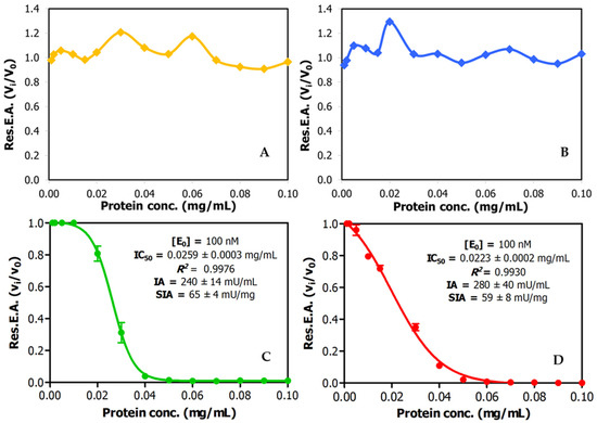 Dose–response relationships for trypsin inhibitory activity in crude plant seed extracts and derivation of IC50 values. Effects of different doses of crude extracts on trypsin activity: (A) quinoa; (B) lupine; (C) Amaranthus hybridus (sangorache); and (D) Amaranthus caudatus (kiwicha). The substate was 1.0 mM of bApNA. Res.E.A.: residual enzymatic activity. IA: inhibitory activity. SIA: specific inhibitory activity.