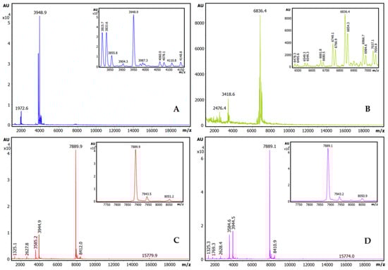 To better identify the molecules responsible for such strong binding capabilities (probably inhibitors), the same affinity-based IF-MS approach, was applied at semi-preparative levels and in larger centrifugal microcolumns to the seed extracts of the four plant species, using the trypsin-Sepharose CL4B matrix as the capturing agent. As seen in Figure 2, the main components visible after IF-MS appear at 3948.9, 6836.4, 7889.9, and 7889.1 mz for each species, although some spectral heterogeneity appear for the quinoa and lupine species, which are probably real but are also indicative of the low concentration of the captured molecules that are present in the seeds. The lower-intensity spectral signals at about 2× and 0.5× the main m/z values are clearly visible for A. hybridus and A. caudatus, signals that most probably corresponding to double- and half-charged MALDI signals, which are also present in the other two plants (particularly for the 2× values). To be confident of the genuine origin of the visualized main mass spectrometry signals, the MS-MALDI spectra of the crude extracts of A. caudatus, of the different washes, and of the final eluted sample (in the present case, using acid-based detachment of the inhibitors from the matrix) were compared, as displayed in Figures S1 and S2 It can be seen that none of the signals that appear in the final eluted sample, besides the main one at 7889.1 m/z, are visible, neither at the initial crude samples nor at any of the washes: i.e., this occurred for the 8840 m/z signal, which is visible in both the crude sample and in the non-binding eluate. By contrast, due to equivalent reasons, the 8337 m/z signal, although of minor occurrence and only present in some batches, it could be a genuine binder. All of these analyses stimulated us to concentrate research on the inhibitor from the A. caudatus species, one of the amaranths that garners more agricultural and nutritional interest nowadays.