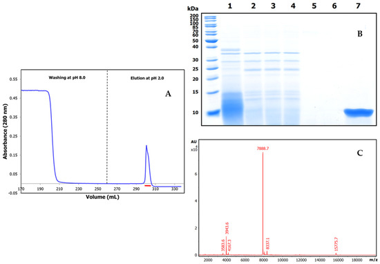 Once the Amaranthus caudatus trypsin inhibitor of 7889.1 m/z, abbreviated here as ATSI, had been visualized as the most promising target among those assayed, we purified it with enough (on a large scale) quantities from trustable and certificated seeds. For this, we extended the analytical affinity-based approach to the preparative level, using a 25 mL trypsin-glyoxal Sepharose CL4B column with a high load of extract. We applied a slightly alkaline buffer (pH 8.0) to the column and washed it, followed by elution in acidic conditions (pH 2.0)The chromatographic profile, shown in Figure 3A, indicated the clean separation of a fraction with high trypsin inhibitory capability, confirmed to be practically pure by RP-HPLC (C8), PAGE analysis, and high resolution MALDI-TOF.MS spectrum, shown in Figure 3B, C. In these conditions, the spectrum confirmed a molecular mass of 7888.7 m/z for its single-charged species, with signals at 3943.6 and 15,775.7 for the 2.0× and 0.5× charged ones.