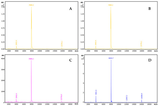 Identification of trypsin inhibitors by intensity-fading MALDI-TOF MS in crude plant seed extracts on bovine trypsin-glyoxal SepharoseR. Stack view of the mass spectra from plant extracts corresponding to the elution fractions of IF-MALDI-TOF MS analyses on bovine trypsin-glyoxal Sepharose® CL4B. (A) Quinoa. (B) Lupine. (C) A. hybridus (sangorache). (D) A. caudatus (kiwicha). The elution from the affinity matrix was performed with 0.5% v/v TFA. Assays were carried out in duplicate, at room temperature. See details in the Section 4.