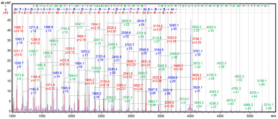 We confirmed the identity of our purified protein with the A. caudatus inhibitor identified by J Hejgaard et al. (1994) [11] by MALDI-TOF.MS/MS fragmentation, with ISD and CID, in the presence of the 2,5-DHB matrix. The derived spectra clearly displayed long fragmentation ladders, with c, y, and Z+2 fragments from positions 9–46, 9–31, and 9–32, as shown in Figure 6 and Figure S3. Very similar spectra were generated from the A. hybridus inhibitor. All of this, together with precise identical molecular masses of 7888.7 m/z, allowed us to confirm the identity of the here-isolated ATSI sequence with the one initially reported above, as well as that of the sequence between the ATSI inhibitors found in the two amaranth species. Inhibitors purified from both amaranth species were identical. All our data, along with the precise identical molecular mass of 7888.7 m/z, support the identity of the here-isolated ATSI sequence protein being the same as the previously reported inhibitor [11].