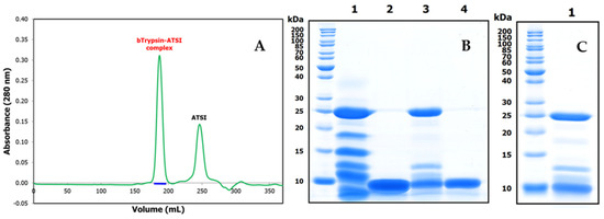 To start analyzing in detail the complexes that ATSI could establish with standard serine proteases, we assayed the formation and isolation of a binary complex of the inhibitor with bovine trypsin as an experimental model. This was achieved by mixing both molecules in the presence a 2:1 molar excess of ATSI over trypsin, at pH 8.0 and 25 °C, in 20 mM Tris-HCl, 150 mM NaCl, and 20 mM CaCl2. After incubating the complex for 30 min., subsequent gel filtration chromatography of the mixed sample through a Superdex 75 High load column, in the same buffer, allowed a clean separation of the complex from the excess inhibitor and the purification of the former, as shown in the SDS-PAGE (see Figure 7) and RP-HPLC results. It is noteworthy that, in spite of elution occurring in a very symmetric gel filtration peak, the sample from the complex displayed in the electrophoresis two additional bands of intermediate masses between the ones from trypsin and ATSI that resembled the formation of autolytic large and limited trypsin fragments, previously well reported for trypsin [16,17]. This could indicate that the overall Stokes radius of the complex is not affected by such cleavages, if by any, and that the conformation and main structure–function determinants of trypsin, when held by disulfides, are not grossly affected. With the prepared complex readily crystallised, this allowed for the clean resolution of its three-dimensional structure (see below). It is noteworthy that the potentially remaining trypsin activity of the complex was found to be null, and the X-ray electron density maps did not reflect any evidence of cuts/discontinuities at the protein inhibitor main chain (see next section). This probably reflects the fact that trypsin (isolated or in complex) mainly autolysed when mixed with the SDS buffer of PAGE, but it was intact within the analysed complex.