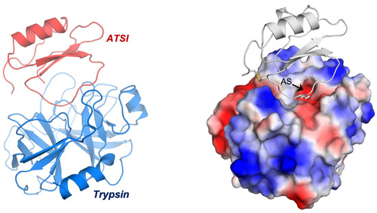 The observed high homogeneity of the trypsin inhibitor from A. caudatus seeds, with the expected easy scalability, and its strong inhibitory potency versus the enzyme, with Ki at a low nanomolar level for trypsin, together with the large agricultural, biotechnological, and nutritional interest in this plant species [8,42], prompted us to select it for further structure–function analyses. Given this selection, and to be respectful to the ATSI abbreviation initially suggested by Hejgaard et al. (1994) [11] for the inhibitor from the A. caudatus species, we kept it throughout this work. In the next step, we conducted detailed X-ray crystallisation studies of it in complex with trypsin. This was achieved with the known model bovine trypsin, when mixed 2:1 (mol:mol) with an excess of the inhibitor, which was followed by incubation at 25 °C. The formed complex, isolated and purified by gel filtration chromatography, gave rise to well-formed crystals and excellent X-ray electron density maps, allowing us to trace the full complex structure without discontinuities. Hence, the unexpected mid-size faint bands that appeared in the electrophoretic analysis of the complex, probably due to trypsin autolytic action in the SDS-PAGE loading buffer, were not taken into consideration, as already mentioned at the end of Section 2.4. of the Results.
