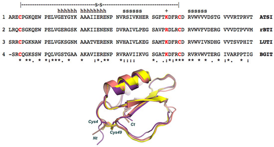 The here-derived structure facilitates the classification of ATSI as a member of the structural–functional family of potato-I plant inhibitors, joining other ones from plants assigned to this family, as is the case for rBTI from Buckwheat, LUTI from Linum usitatissimum (var Linum humile), and BGIT from Momordica charantia (Bitter gourd), to which it aligns very well, as shown in Figure 9. The availability of the detailed three-dimensional structure of ATSI could facilitate future protein engineering studies: i.e., by adding disulfides to it in order to strongly increase its stability. Such mutations probably would improve its endurance and capability to act as an inhibitor on pest enzymes in in vivo transgenic plants, an application already reported for other protease inhibitors [26].