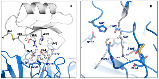 To maintain the correct conformation of the binding loop of ATSI for the substrate-like inhibition of trypsin, several contacts are formed inside ATSI between the residues of the ß2-strand and the binding loop. It is noticeable that Arg51 plays a role in ATSI, sandwiched as it is between a hydrophobic interaction with Trp53 and an electrostatic interaction with the C-terminal carboxylate end of ATSI (2.9 Å). Arg51 also forms a salt bridge with Asp46 from the binding loop (3.0 Å), which, in addition to forming a hydrophobic interaction with Phe43, helps to maintain the correct conformation of the binding loop for the right orientation of the substrate-like Lys45 to fit into the binding pocket of trypsin (Figure 10A). All these interactions described in ATSI from amaranth are conserved in other homologues of the family, such as lute or rBTI [18], whose complex three-dimensional structures are known. In other members of the family, some substitutions in this region can be observed, but in all cases, the fixed conformation of the binding loop, which is essential for the inhibition, is maintained.