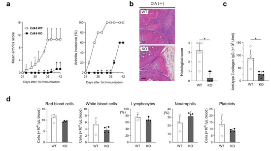 - Fujii, R.; Komatsu, R.; Sato, T.; Seki, I.; Konomi, K.; Aono, H.; Niki, H.; Yudoh, K.; Nishioka, K.; Nakajima, T. SPACIA1/SAAL1 deletion results in a moderate delay in collagen-induced arthritis activity, along with mRNA decay of Cyclin-dependent kinase 6 Gene. Int. J. Mol. Sci. 2018, 19, 3828. [Google Scholar] [CrossRef]
