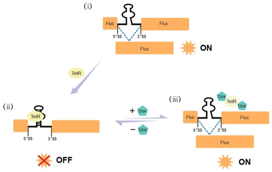 The chosen intron sequence comprises a 5’SS derived from human beta-globulin and a 3’ splice site (3’SS), both exhibiting favorable splicing properties []. We created a chimeric intron by introducing a fusion construct comprising an RNA riboswitch and a TetR aptamer into this particular intronic region in order to confer an engineered regulatory function. As shown in Figure 1, this integrated device is located in the Fluc gene, allowing for the reversible modulation of Fluc expression through interactions between the TetR aptamer and its corresponding ligand: without doxycycline (Dox), the aptamer’s binding to the TetR protein forms a stem–loop structure. This distorts the initial assembly of the 5’SS spliceosome, retaining the introns and resulting in an incorrect reading frame for the Fluc gene. However, Dox enables TetR to be released from aptamer RNA, exposing the original 5’SS and allowing intron removal to restore normal gene expression.