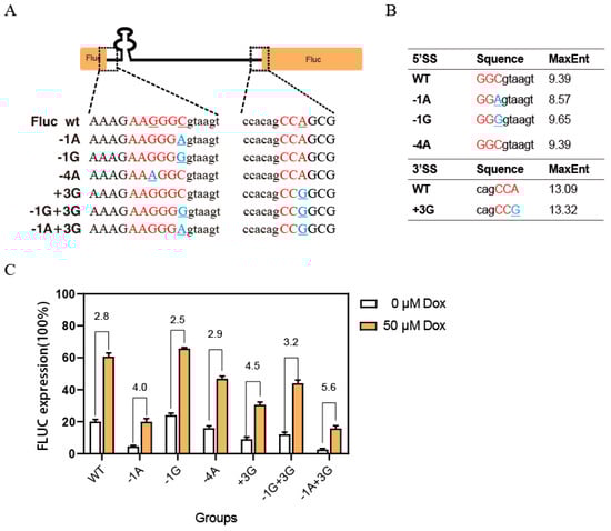 Firstly, the effect of mutations on the exon–intron boundary sequence was examined. Specifically, a series of mutations was introduced into the Fluc exon ranging from −6 bp to −1 bp, upstream of the 5’SS of the aforementioned intron (Figure 2A). MaxEnt, a framework for modeling sequence motifs based on the maximum entropy principle (MEP), was used to predict the RNA splicing signals in short sequences. It was predicted that the −1C>G(−1G) mutation would exhibit a higher splicing efficiency than the wild type (9.65 vs. 9.39). This enhanced splicing capacity was further confirmed by higher luciferase expression levels. In contrast, the −1C>A(−1A) mutation significantly reduced the efficiency of spliceosome recognition, as evidenced by a lower splicing score (8.57) (Figure 2B,C).