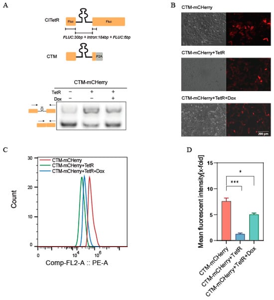 Figure 5 illustrates that the experimental group exhibited optimal RNA-level regulation 48 h after Dox addition, while this regulatory capacity diminished 48 h after Dox removal. The reintroduction of Dox fully restored the regulatory function. This suggests that Dox concentration changes confer a continuous and dynamic regulatory capacity on the system. Thus, the CTM-mCHerry structure presented a reversible and persistent pattern of gene expression, as indicated by the fluctuations in mCherry fluorescence. This pattern is characterized as “ON–OFF–ON”, thereby opening up a wide range of potential applications for TetR in controlling intron splicing.