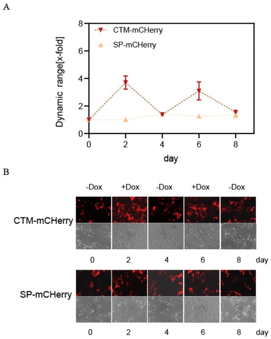 (A,B) The long-term and reversible dynamic regulation of CTM-mCHerry was assessed over an 8-day period by monitoring changes in the Dox concentration, with validation through RT-PCR or analysis of fluorescence intensity variations. Primer information is provided in Supplementary Figure S10. SP-mCHerry is a negative control without a switch. The error bars indicate the mean ± s. e. m.