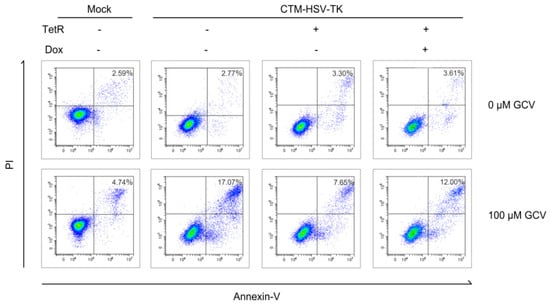 CTM-HSV-TK controls the HSV-TK/GCV system. CTM-HSV-TK and TetR protein particles were co-transfected into Hela cells and treated with 50 μM of Dox for 4–6 h. The effect of Dox on flow cytometry was observed after 36 h. The addition of the TetR ligand significantly attenuated the rate of apoptosis, which was subsequently restored upon Dox induction. The PE Annexin V/7-AAD apoptosis detection kit was used to stain the cells and control cell colors determine threshold localization. Living cells were negative for Annexin V and 7-AAD, apoptotic cells were positive for Annexin V but negative for 7-AAD, and dead cells were positive for both.