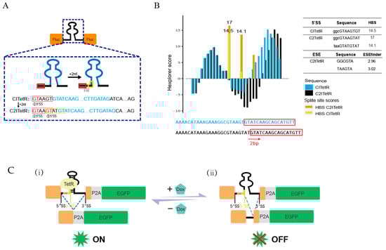In this study, an artificially constructed RNA element was employed to regulate the alternative splicing of Pre-mRNA in human cells for the purpose of controlling gene expression. We constructed a TetR ligand-regulated “on-switch” CTM and an “off-switch” C2ITetR>4A. Based on the precise recognition of exon–intron boundaries at 5’SS and 3’SS single nucleotides [,], a series of mutations was engineered to enhance splicing efficiency, while the splicing regulatory elements (SREs) showed their more powerful influence on the spliceosome []. For example, the -4G>A mutation in CITetR, although possessing a high splicing score, markedly diminishes the splicing efficiency due to the introduction of an exonic splicing silencer (ESS). The primary contribution of SREs is the identification of an ESE between the two 5’ splice sites in C2ITetR. This discovery can modify the selection of splicing sites at the 5’ splice site, thereby becoming a key mechanism for reversing the switch.