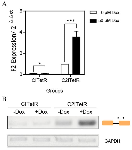 (A) Intron-retention sequence of C2ITetR was analyzed using qPCR in the presence of Dox or without Dox. The upstream primer from the intron sequence and the downstream primer from the P2A sequence. CITetR was used as a negative control. (B) The intron-retention sequence of CITetR/C2ITetR was analyzed using RT-PCR, with GAPDH serving as an internal reference. Primer information is provided in Supplementary Figure S9. (* p < 0.05 and *** p < 0.001; unpaired Student’s t-test).
