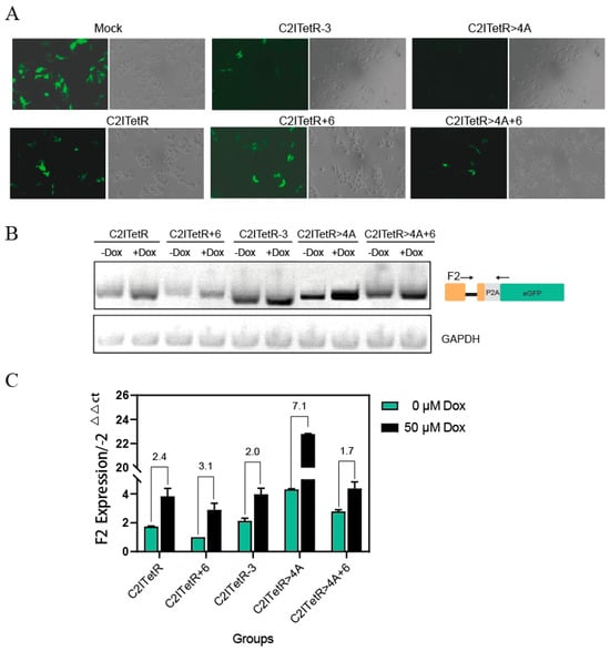 During our research, we unexpectedly discovered that shifting the TetR aptamer in the CTM module 2 base pairs to the right within the intron sequence resulted in regulatory behavior that was entirely contrary to that of the CTM: after incorporating this modified sequence into the eGFP exon, in the absence of Dox, the gene expression increased, while the addition of Dox reduced eEGFP expression. This new structure has been designated as “C2ITetR”.