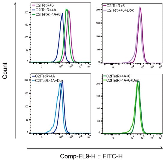 Flow cytometry analysis was performed on various mutant modules. The average fluorescence intensity histogram of each mutant element in the absence of Dox is presented in the upper-left panel. The lower-left, upper-right, and lower-right panels represent the comparative average fluorescence intensities of C2ITetR>4A, C2ITetR+6, and C2ITetR>4A+6, respectively, with or without Dox. The regulatory effect of Dox on C2ITetR>4A is superior.