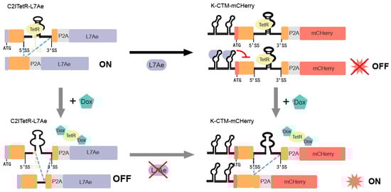 As illustrated in Figure 11, the L7Ae gene is placed downstream of the “off-type” switch CI2TetR>4A (CI2TetR-L7Ae), while the K-turn sequence is located in the 5’UTR region of the “on-type” switch (K-CTM-mCherry). The lack of external Dox kept the CI2TetR-L7Ae switch in the “off state”, increasing the L7Ae protein. This allows L7Ae to bind to the K-turn region in the 5’ UTR of K-CTM-mCHerry. This configuration is expected to result in a more stringent mCHerry regulation under the influences of both the L7Ae protein and Dox. In contrast, the introduction of Dox decreases the expression of L7Ae and facilitates the dissociation of TetR from RNA, allowing splicing to be restored in K-CTM-mCHerry, and consequently restoring mCherry expression.