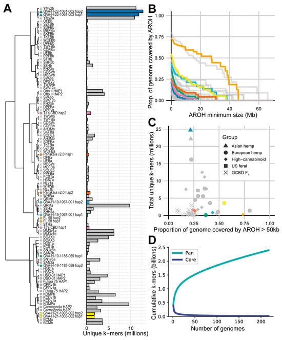 Unique k-mers were extracted from a PanKmer index of 217 C. sativa assemblies. The PanKmer collector’s curve (Figure 1D) shows a continued increase in the cumulative number of k-mers as more assemblies are added to the index. The number of unique k-mers in each assembly was somewhat associated with the population or diversity group origin of the assembly. Overall, high-cannabinoid assemblies, particularly the OCBD F1 assemblies, had lower numbers of unique k-mers, most with fewer than 1 million per haplotype (Figure 1A, Supplementary Table S2). In contrast, the European and U.S. feral assemblies tended to have a moderate number of unique k-mers, with most between 1.5 and 8 million per haplotype (Figure 1A, Supplementary Table S2). The Asian hemp assemblies had the greatest counts, with greater than 10 million unique k-mers in each haplotype (Figure 1A, Supplementary Table S2). The two additional phased contig-level Asian hemp assemblies, YMMv1 and CNBv1, further illustrate this with particularly large counts of 28.6 million and 43.2 million unique k-mers, respectively (Supplementary Table S2).