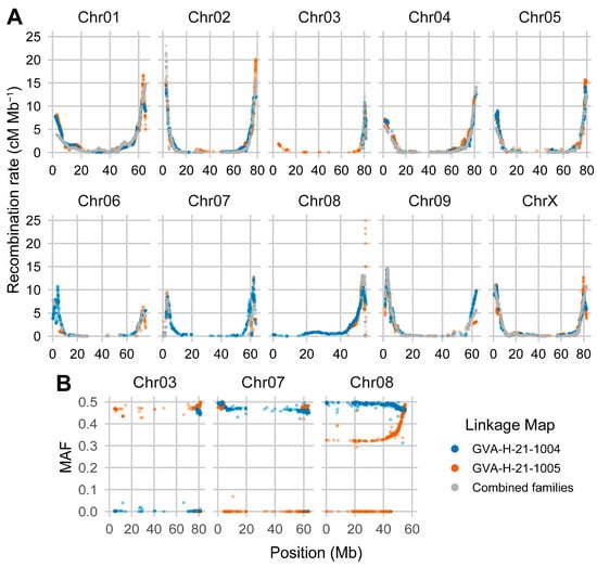 Estimated recombination rate across the 10 chromosomes of C. sativa. (A) Recombination rate plotted against position. Colors in both panels represent the linkage maps for each of the ‘FL 58’ × ‘TJ’s CBD’ F2 families as well as the map from the combined data of both families. (B) Minor allele frequency (MAF) plotted against position on Chr03, Chr07, and Chr08 for the two F2 families.