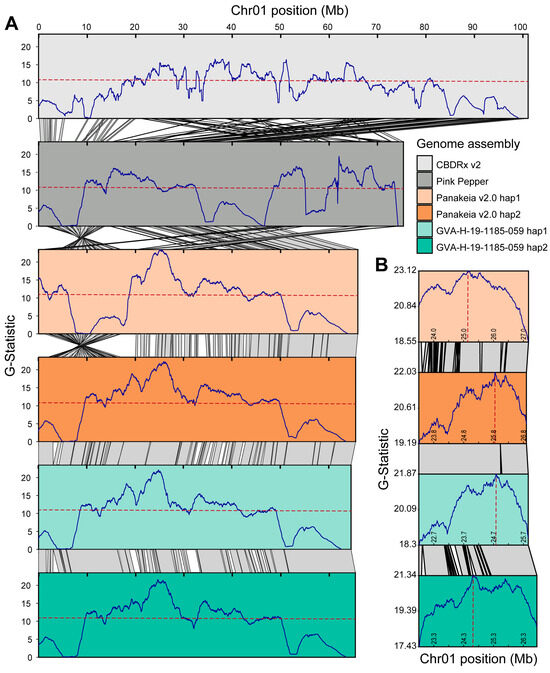 Alignment of Chr01 from CBDRx v2 (cs10, NCBI GenBank GCA_900626175.2) and Pink Pepper (ASM2916894v1, NCBI GenBank GCA_029168945.1), the previous and current NCBI C. sativa reference genomes, respectively, to newly assembled genomes illustrated multiple assembly errors (Figure 4A). BSA data from Toth et al. [9] were re-analyzed using both haplotypes of ‘Panakeia v2.0’ and GVA-H-19-1185-059. The G-statistic peaks in all four new assemblies showed strong agreement (Figure 4A), with slight positional variations in the peak markers among assemblies (Figure 4B). By considering consensus across analyses with all four assemblies as references, the most significant peak region for Early1 can be narrowed to a ~2 Mb syntenic region on Chr01. This is substantially smaller than the fragmented region observed in CBDRx v2 and Pink Pepper, where numerous small peaks span over 40 Mb (Figure 4A).