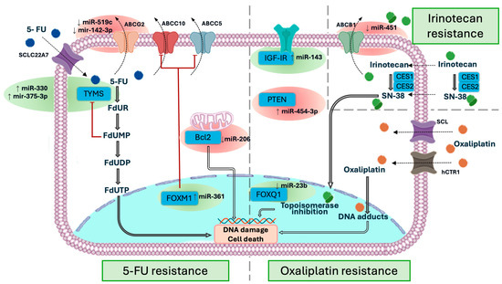 Figure 1. miRNA-associated mechanisms of resistance to 5-fluorouracil, oxaliplatin, and irinotecan. Each circle represents a key regulatory site modulated by a microRNA that promotes either chemosensitivity (green circles) or chemoresistance (red circles).