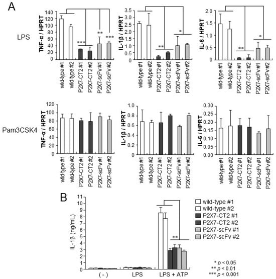 LPS-stimulated cytokine expression and production in BMDMs. (A) Quantitative real-time PCR was performed on RNA derived from wild-type, P2X7-CT2 Tg, and anti-P2X7scFv Tg BMDMs activated by LPS or Pam3CSK4 stimulation. Expression levels are shown relative to control HPRT. Values represent means ± SE of triplicate assays. (B) Wild-type, P2X7-CT2 Tg, and anti-P2X7-scFv Tg BMDMs were pretreated with or without LPS for 4 h, followed by treatment with or without ATP for 1 h. The culture supernatants were analyzed by ELISA to measure IL-1β levels. Values represent means ± SE of triplicate cultures. The profiles are typical examples of at least three independent experiments. #1 and #2 were clones each independently isolated from wild-type, P2X7-CT2 Tg, and anti-P2X7-scFv Tg mice. One-way ANOVA was used to calculate p values when compared to wild-type. * p < 0.05, ** p < 0.01, *** p < 0.001.
