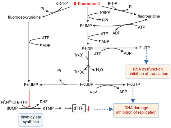 Molecular consequences of administration of 5-fluorouracil. R-1-P—ribose monophosphate; dR-1-P—deoxyribose monophosphate; Pi—phosphate; PRPP—5′-phosphoribosyl-1-pyrophosphate; PPi—pyrophosphate; F-UMP—fluorouridine monophosphate; F-UDP—fluorouridine diphosphate; F-UTP—fluorouridine triphosphate; F-dUMP—fluorodeoxyuridine monophosphate; F-dUDP—fluorodeoxyuridine diphosphate; F-dUTP—fluorodeoxyuridine triphosphate; dUMP—deoxyuridine monophosphate; dTMP—deoxythymidine monophosphate; dTTP—deoxythymidine triphosphate; 5,10-CH2-THF—N5,N10 Methylenetetrahydrofolate; DHF—dihydrofolate; Trx(r)—thioredoxin reduced; Trx(o)—thioredoxin oxidized; ATP—adenosine triphosphate; ADP—adenosine diphosphate; DNA—deoxyribonucleic acid; RNA—ribonucleic acid.