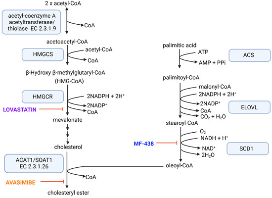 Molecular targets of used inhibitors. ACS—Acyl-CoA synthetases, ELOVL—fatty acid elongases, HMGCR—hydroxymethylglutaryl-CoA reductase, HMGCS—hydroxymethylglutaryl-CoA synthase, SCD1—stearoyl-CoA desaturase-1. In the case of enzymes for which the same abbreviation is sometimes used, the EC number is also provided.