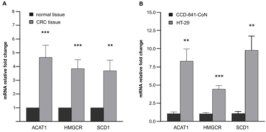 ACAT1, HMGCR, and SCD1 mRNA levels (A) in colon cancer tissue samples from CRC patients vs. normal colon mucosa tissues obtained from CRC patients; (B) in HT-29 cells colon cancer cell line vs. CCD-841-CoN control colon cell line. Data are presented as mean ± SEM. Statistical significance in comparison to the control group was marked as follows: for ** p ≤ 0.01; *** p ≤ 0.001.