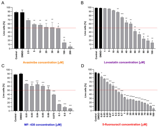 The effect of treatment with increasing concentrations of (A) Avasimibe, (B) Lovastatin, (C) MF-438, and (D) 5-fluorouracil (μM) on HT-29 cell viability. The red line represents the IC50 cut-off. Data are shown as mean ± SEM. Statistical significance in comparison to the control group is marked as follows: for * p ≤ 0.05; ** p ≤ 0.01; *** p ≤ 0.001.