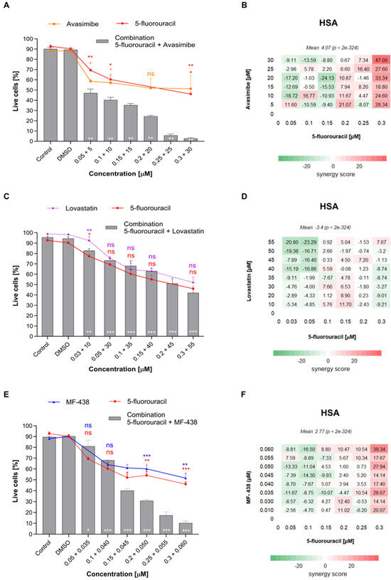 The effect cell viability and synergy heat map of treatment with increasing concentrations of (A,B) 5-FU and Avasimibe, (C,D) 5-FU and Lovastatin, and (E,F) 5-FU and MF-438. Data on graphs are shown as mean ± SEM. Statistical significance in comparison to the control group is marked down on the representing bars in white; whereas comparison to the result of drug effect alone is marked on the top of the bar in the corresponding color as follows: for * p ≤ 0.05; ** p ≤ 0.01; *** p ≤ 0.001, ns no statistical significance. On heat maps, each square represents a synergy score for a specific dose of drug combination.
