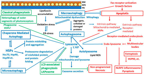 Schematic presentation of the intersection between degradative pathways in RPE cells. HSP involvement in phagocytosis, different types of autophagy, and cell death. RPE cells are constantly subjected to phagocytosis of photoreceptor outer segment discs and exposed to oxidative stress. Degradative pathways in RPE cells and associated processes are indicated by arrows with the corresponding colors: types of phagocytosis (green), types of autophagy (blue), and forms of cell death (red). Photoreceptor outer segment discs are phagocytosed by the RPE (heterophagy) and are degraded in the lysosomes in the process of LAP. LAP bridges the phagocytic and canonical autophagic pathways. Abbreviations: RPE—retinal pigment epithelium; ROS—reactive oxygen species; ER—endoplasmic reticulum; LMP—lysosome membrane permeabilization; LAP—LC3-associated phagocytosis; HSPs—heat shock proteins.