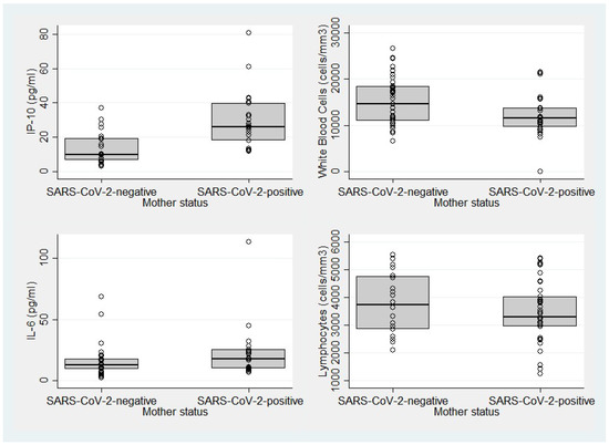 Boxplots of IP-10, IL-6, white blood cell count, and lymphocyte count compared between neonates of SARS-CoV-2-negative and -positive mothers.