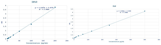Serum levels of IL-6 and Human IP-10 were measured using commercial ELISA kits from Abcam, Cambridge, UK (catalog number for IL-6ab178013: and for Human IP-10: ab173194) as per the manufacturers’ protocols. Samples, including standards of known Human IP-10 Lyophilized Recombinant Protein and Human IL-6 Lyophilized Recombinant Protein content, and samples of the protocol of our study, were pipetted into these wells. During the first incubation, Human IP-10 and IL-6 antigens bound to the immobilized (capture) antibodies on one site. After washing, biotinylated monoclonal detector antibodies specific to Human IP-10 and IL-6 were added. During the second incubation, this antibody bound to the immobilized Human IP-10 and IL-6 captured during the first incubation. After the second incubation, a substrate solution was added, which was acted upon by the bound enzyme to produce color. We measured the absorbance of each well at 450 nm, after adding 100 μL of stop solution. The intensity of this colored product was directly proportional to the concentration of Human IP-10 and IL-6 present in the original specimen. All the standards, controls and samples were measured in triplicates. The mean absorbance was calculated for each set. A linear regression analysis (r2 value was 0.99) was used to generate a standard curve. The concentrations of the samples were calculated according to the linear equations (Figure 2).