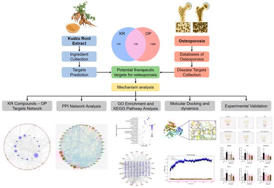 Traditional medicinal foods have been used in China for thousands of years and many of them are widely used in the treatment of OP [7,8,9]. Kudzu root (KR), a dried radix of Pueraria lobata (Willd.) Ohwi, named “Gegen” is indigenous to Southeast Asia and has been used as a food source, animal fodder, and medicinal remedy for thousands of years. Its traditional medicinal efficacy includes the prevention and treatment of endocrine system and cardiovascular diseases, such as diabetes, hypertension, and cerebral ischemia and reperfusion [10,11]. With further intensive research, the anti-osteoporotic efficacy of KR has increasingly attracted attention due to the estrogenic-like effects of its bioactive compounds. KR extract can ameliorate postmenopausal bone loss by promoting estrogenic activity and decreasing bone turnover markers in ovariectomized rats [12]. Another study has found that KR can completely prevent bone loss in ovariectomy (OVX) mice without inducing estrogenic effects in the uterus. These effects appear to be associated with the high content of the isoflavones daidzein and genistein [13]. Meanwhile, puerarin, the main isoflavone glycoside in KR, can ameliorate OVX-induced mice by suppressing osteoclastogenesis via inhibition of the TNF receptor-associated factor 6 (TRAF6)/ROS-dependent mitogen-activated protein kinase (MAPK)/NF-κB signaling pathways and concurrently promotes the proliferation and differentiation of osteoblasts by stimulating osteoprotegerin and inhibiting RANKL and interleukin 6 (IL6) production [14,15,16]. Despite these discoveries, the precise targets and underlying integrated pharmacological mechanisms by which KR prevents OP have not yet been systematically investigated.