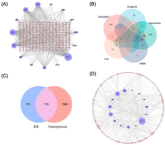 Acquisition of KR-OP-targeted proteins. (A) Network of targets predicted using the KR-derived compounds. (B) The Venn diagram of OP-related targets. (C) The Venn diagram of 119 anti-OP targets of KR. (D) The compound-target network implicated in the OP treatment using KR. Purple nodes indicate active compounds, and red nodes indicate target proteins.