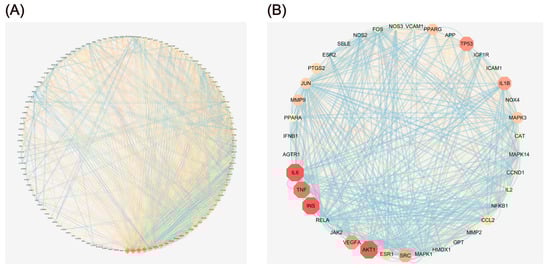 After overlapping the drug- and disease-related targets, the PPI of each target was generated from the STRING database [61]. This database defines a PPI according to the interaction scores [high (>0.7), medium (>0.4), and low (>0.15)]. In this study, the medium confidence score of 0.4 was used to construct the PPI network.