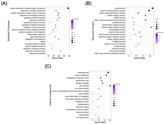 GO enrichment analysis of the anti-OP targets of KR. (A) Biological processes, (B) molecular function, and (C) cellular components.