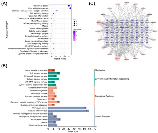 KEGG pathway enrichment analysis of the anti-OP targets of KR. (A) Top 20 KEGG pathways. (B) The distribution of pathways for the anti-OP targets of KR annotated in the KEGG database. (C) The target-pathway network implicated in the mechanism of KR in OP treatment. Red nodes indicate the pathways, purple nodes indicate the targets involved in these pathways. The interactions between the targets and the pathways are represented by edges, and the node is proportional to the degree of interaction.