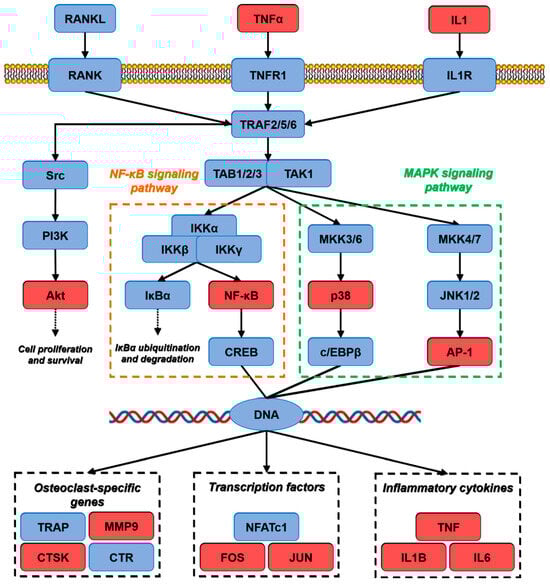 - Zhang, Y.H.; Heulsmann, A.; Tondravi, M.M.; Mukherjee, A.; Abu-Amer, Y. Tumor necrosis factor-alpha (TNF) stimulates RANKL-induced osteoclastogenesis via coupling of TNF type 1 receptor and RANK signaling pathways. J. Biol. Chem. 2001, 276, 563–568. [Google Scholar] [CrossRef] [PubMed]