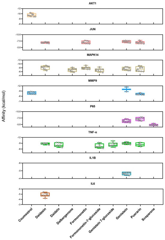 In summary, the results of molecular dynamics simulations indicated that Coumestrol, Formononetin, Genistein, Puerarin, and Genistein 7-glucoside could stably bind to AKT1, MAPK14, MMP9, and TNF-α, respectively, while Puerarin showed stable binding to JUN and P65. These findings were aligned with the results of molecular docking and network pharmacology.