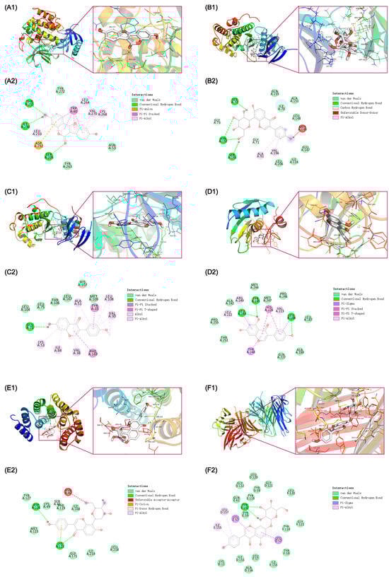 Molecular docking diagram for complexes of the KR active compounds-protein targets. Binding mode of Coumestrol (KR3) to AKT1 (A1), Puerarin (KR13) to JUN (B1), Formononetin (KR7) to MAPK14 (C1), Genistein (KR11) to MMP9 (D1), Puerarin (KR13) to P65 (E1), and Genistein 7-glucoside (KR9) to TNF-α (F1). (A2–F2): Two dimensional patterns of bond, respectively.