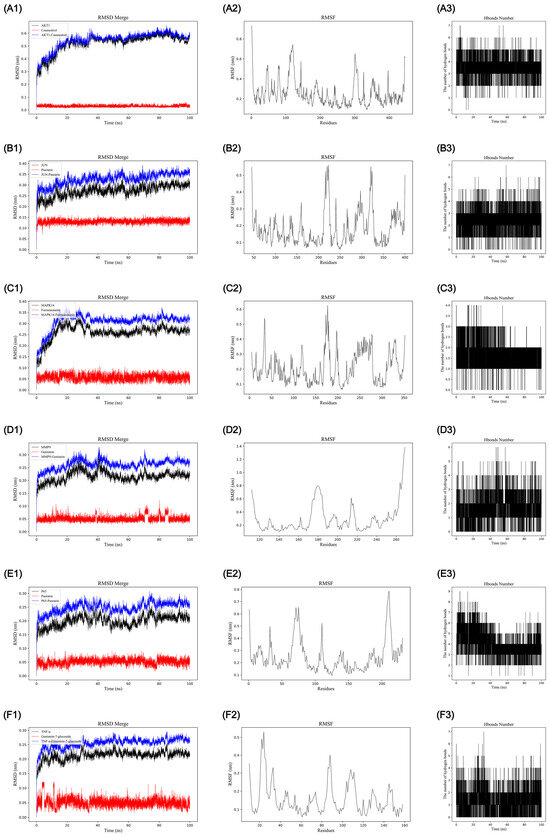 Molecular dynamics simulation of the Coumestrol-AKT1 (A1–A3), Puerarin-JUN (B1–B3), Formononetin-MAPK14 (C1–C3), Genistein-MMP9 (D1–D3), Puerarin-P65 (E1–E3), and Genistein 7-glucoside-TNF-α (F1–F3) complexes. (A1–F1) RMSD curve. (A2–F2) RMSF curve. (A3–F3) Hydrogen bonds.