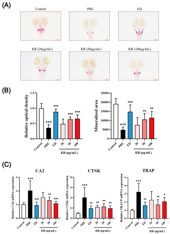 The effects of KR on bone mineralization of zebrafish larvae skull. (A) The dorsal aspect head bone stained with ARS in zebrafish larvae at 9 days postfertilization (dpf) with or without exposure to KR (20 μg/mL, 50 μg/mL, and 100 μg/mL). (B) The effect of KR on bone relative optical density and bone mineralization area in 9-dpf zebrafish. (C) The effect of KR on osteoclast-gene expression in 9-dpf zebrafish. ### p < 0.001 compared with control. * p < 0.05; ** p < 0.01; *** p < 0.001 compared with PRE.