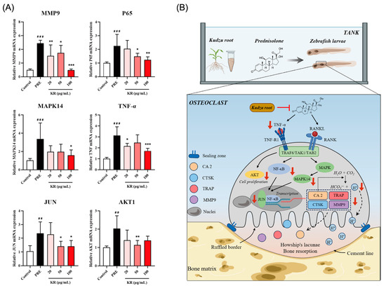 The network pharmacology and molecular docking and dynamics results indicated potential key targets and pathways for KR against OP. In this study, the experimental validation was also performed through a PRE-induced OP model in zebrafish. The mRNA expression levels of these key targets (MMP9, P65, MAPK14, TNF-α, JUN, and AKT1) in zebrafish larvae were assessed by RT-qPCR. As shown in Figure 11A, compared with the corresponding control group, the mRNA expression levels of MMP9, P65, MAPK14, TNF-α, JUN, and AKT1 were significantly up-regulated in zebrafish larvae by 25 μM PRE (p < 0.01). A total of 20 μg/mL KR extract could significantly reduce the PRE-induced up-regulation of MMP9 and TNF-α; 50 μg/mL KR extract inhibits the mRNA expression levels of MMP9, P65, JUN, and AKT1; and 100 μg/mL KR extract could markedly suppress the mRNA expression levels of MMP9, P65, MAPK14, TNF-α, and JUN. These results further demonstrated that KR could inhibit the PRE-induced promotion of osteoclastogenesis by down-regulating the expression of gene markers involved in the TNF-α/AKT/NF-κB/p38 MAPK signaling axis (Figure 11B), indicating that our network pharmacology-based prediction model for molecular mechanism investigation is reliable.