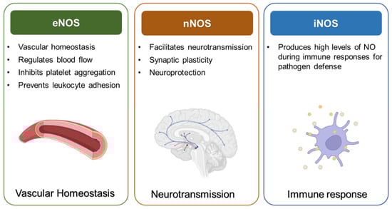 Nitric oxide (NO) is a versatile bioactive molecule integral to numerous physiological processes, including vascular tone regulation, neurotransmission, and immune defense [1]. NO is synthesized enzymatically by nitric oxide synthases (NOS), which exist in three distinct isoforms: endothelial NOS (eNOS), neuronal NOS (nNOS), and inducible NOS (iNOS). These isoforms, while sharing a common enzymatic function of converting L-arginine into L-citrulline and NO, exhibit unique expression patterns and regulatory mechanisms in different cellular contexts (Figure 1) [2,3].