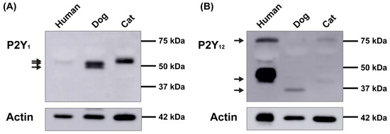 Presence of P2Y1 and P2Y12 in dog, cat, and human platelets. (A,B) PRP was isolated from the whole blood of dogs, cats, or humans to obtain platelets. Whole lysates of platelets were analysed by immunoblotting using an (A) anti-P2Y1 or (B) anti-P2Y12 receptor antibody (top panels) or (A,B) anti-actin antibody (bottom panels). Arrows indicate (A) P2Y1 or (B) P2Y12 receptors. Results are representative of three independent experiments.