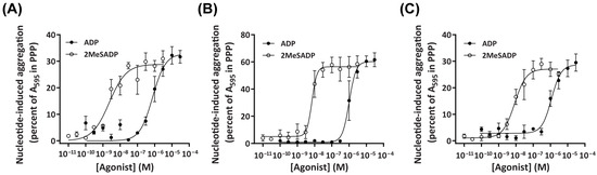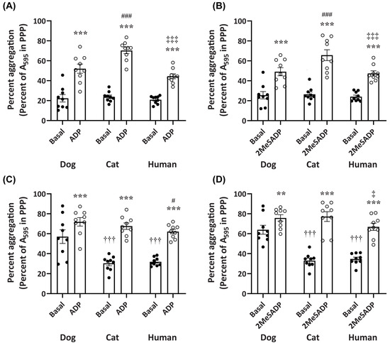 2.2. ADP and 2MeSADP Induce Aggregation of Dog, Cat, and Human Platelets in a Concentration-Dependent Manner