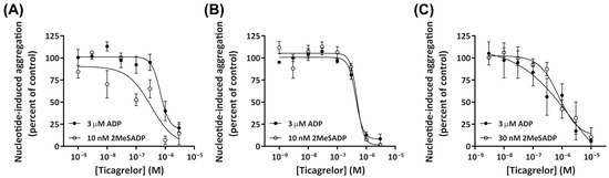 Ticagrelor inhibits ADP- and 2MeSADP-induced aggregation of dog, cat, or human platelets in a concentration-dependent manner. PRP and PPP, isolated from (A) dog, (B) cat, or (C) human whole blood, were pre-incubated in the absence (control; 0.1% DMSO in Tyrode’s buffer) or presence of ticagrelor (as indicated) for 15 min then incubated in the absence (Tyrode’s buffer) or presence of 3 µM ADP or 10–30 nM 2MeSADP (approximate EC80 as determined for each species), and platelet aggregation was measured. Concentration–response curves were plotted using nucleotide-induced percent of aggregation calculated for each PRP sample relative to the percent of nucleotide-induced aggregation in the corresponding PPP sample after 10 min incubation and then normalised to the percent of nucleotide-induced aggregation in the absence of ticagrelor. Data shown for each species are mean ± SEM from three independent experiments.