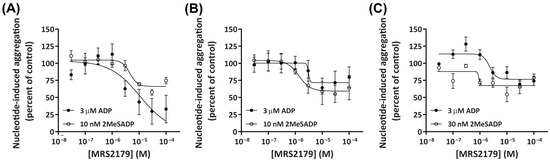 MRS2179 is a selective P2Y1 receptor antagonist that can inhibit nucleotide-induced aggregation of human platelets [50]. To further elucidate the role of P2Y1 receptors in the aggregation of platelets from dogs, cats, and humans, PRP and PPP were pre-incubated in the absence or presence of increasing concentrations of MRS2179 and then incubated in the absence or presence of ADP or 2MeSADP at the approximate EC80 for each species. Pre-incubation with MRS2179 partly inhibited ADP- and 2MeSADP-induced aggregation in platelets from dogs (Figure 4A), cats (Figure 4B), and humans (Figure 4C), with maximal inhibition observed near 30 µM for dog platelets and near 10 µM for cat and human platelets. There were no significant differences in the potency of MRS2179 in response to activation by ADP between dog (pIC50 5.34 ± 0.12), cat (pIC50 5.34 ± 0.24), and human (pIC50 5.51 ± 0.17) platelets when analysed by one-way ANOVA. In contrast, there was a significant difference in the potency of MRS2179 in response to activation by 2MeSADP between dog (pIC50 5.35 ± 0.11) and human (pIC50 6.21 ± 0.20) platelets (p < 0.01); however, no significant differences were observed between these species and cat platelets (pIC50 5.77 ± 0.09). There were no significant differences in the potency of MRS2179 in response to activation by ADP compared to 2MeSADP for any species. Of note, MRS2179 appeared to be a more effective inhibitor of ADP-induced aggregation in dog platelets compared to cat and human platelets (Figure 4A–C).