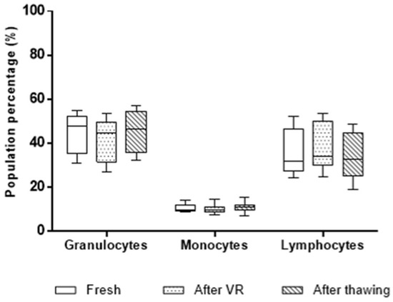Box-and-whisker plots with the proportions of cell populations (granulocytes, monocytes, and lymphocytes) in the 11 analyzed UCB units at the three processing stages: fresh, after volume reduction (VR), and after thawing. A two-way ANOVA analysis revealed no significant differences in cell population proportions between the stages.